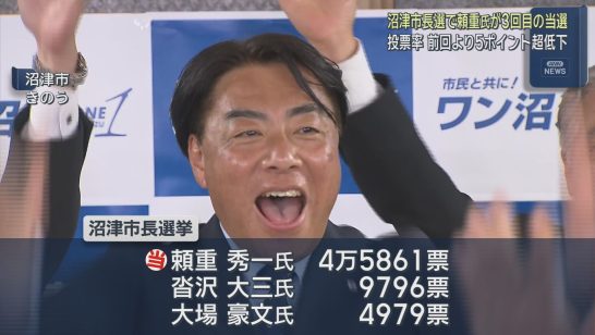 沼津市長選挙は現職の頼重秀一さんが3選 「未来への投資」を訴え新人候補2人に大差