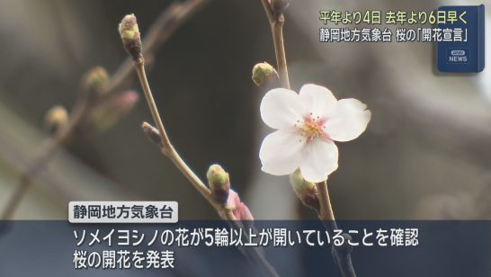 静岡地方気象台がソメイヨシノの開花を発表 平年より4日早く前年より6日早い開花