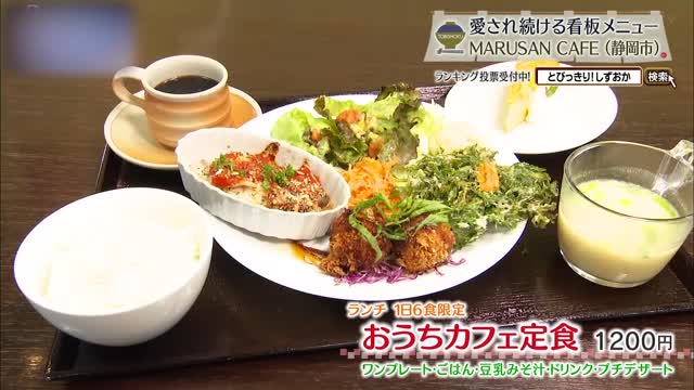 静岡市駿河区東新田。長田東小学校の向かいにあるのが、働くお母さんたちの憩いの場「MARUSAN CAFE」。女性の心と体を気遣った野菜たっぷりのメニューがいっぱい。看板は1日6食限定ランチ「おうちカフェ定食」。肉に魚、副菜、主菜がワンプレートに。優しい口当たりの豆乳のみそ汁にドリンクとデザートまでついていて、店主の心遣いがお皿のすみずみまで行き渡っているようです。