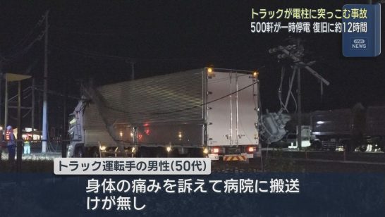 大型トラックが電柱に突っ込む…周辺530世帯で最長12時間停電 静岡・藤枝市