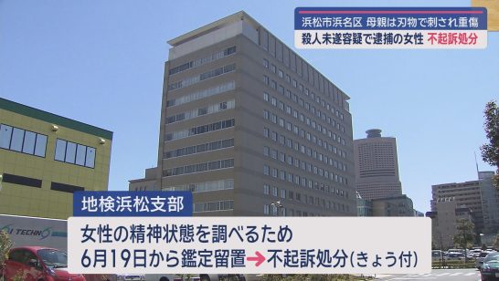 母親を殺害しようとしたとして逮捕された浜松市浜名区に住む27歳の女性が不起訴処分...