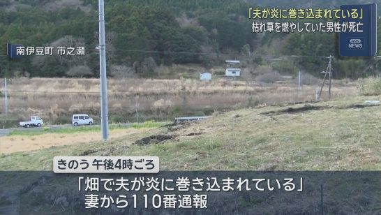 「夫が炎に巻き込まれている」 枯れ草を焼いていた男性の衣類に火が燃え移り死亡 静...