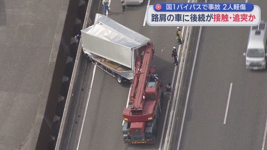 クレーン車とトラック、軽乗用車が衝突する事故 2人がけが 国道1号バイパス下りが...