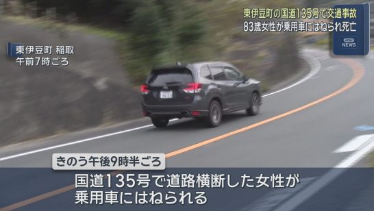 静岡・東伊豆町の国道で道路を横断していた83歳の女性が乗用車にはねられ死亡