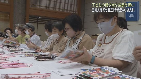静岡・三島市の三嶋大社で七五三用の「千歳飴の袋入れ作業」が始まる