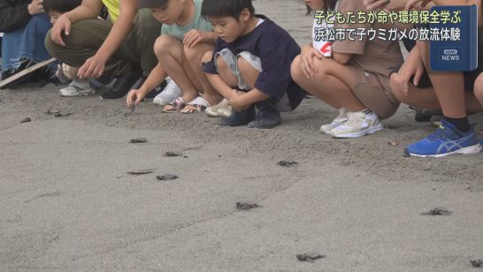浜松市で子どもたちがアカウミガメの赤ちゃんを放流するイベントが開かれる