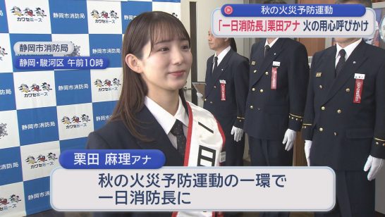 静岡朝日テレビ栗田麻理アナが1日消防長 通行人に火の元の注意を呼び掛けチラシを配...