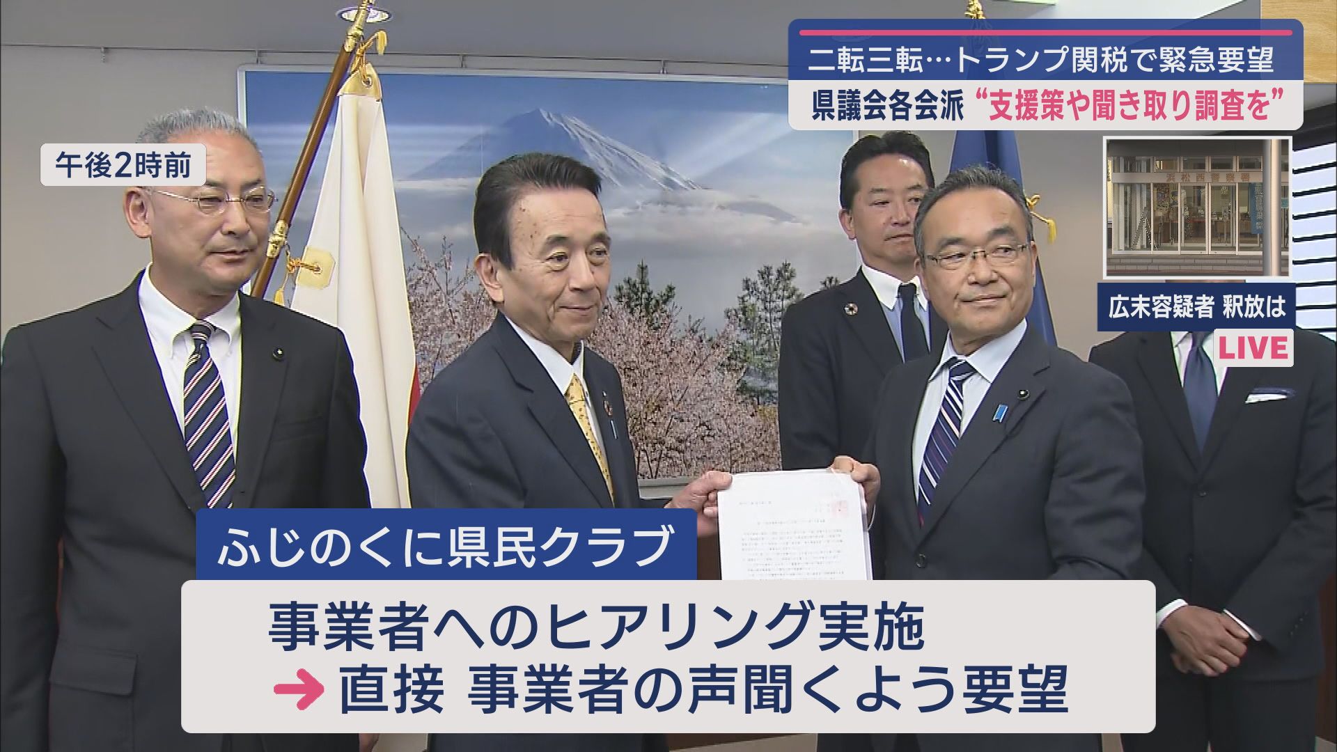 二転三転するアメリカの関税措置を巡り、静岡県議会の各会派は、県民や県内企業への支援策を講じること求める要望書を鈴木康友知事に提出しました。