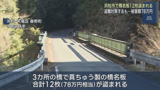 盗難対策をしていたのに… 浜松市で橋の名前が書かれたプレート12枚が盗まれる