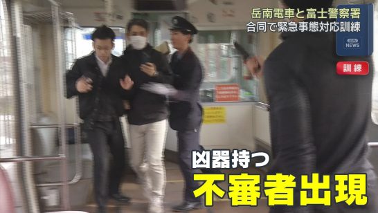 電車内に凶器を持って乗務員を威嚇する不審者が出現したとの想定で警察との合同緊急事...