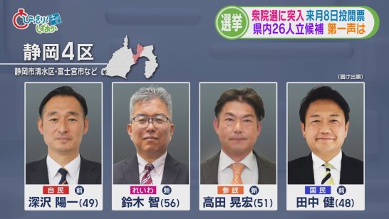 【静岡4区】前回は与野党一騎打ち⇒今回は自民・国民の前職にれいわ・参政の新人の4...