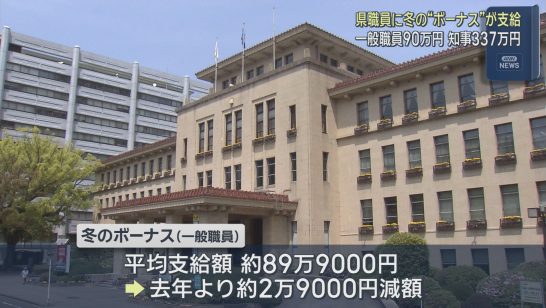 県の職員に冬のボーナスが支給 一般職員は平均およそ90万円、知事はおよそ337万...
