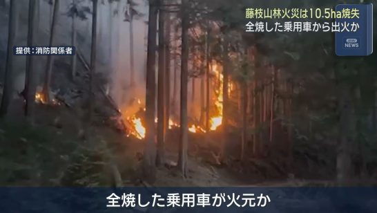 山林を走行して単独事故を起こし出火…山火事の出火元は全焼で見つかった乗用車か 静...